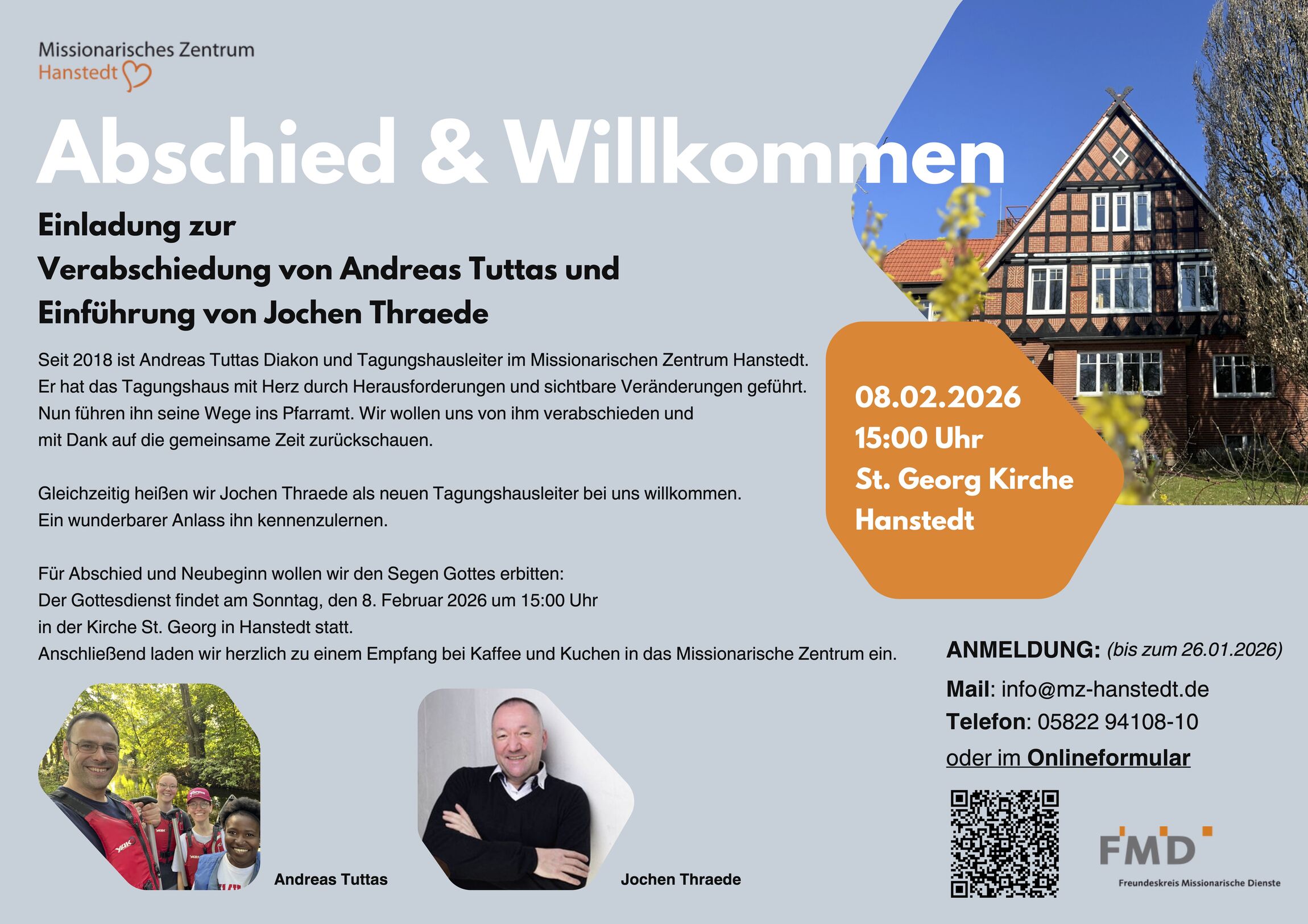 Einladung zur Verabschiedung von Andreas Tuttas und Einführung von Jochen Thraede. Seit 2018 ist Andreas Tuttas Diakon und Tagungshausleiter im Missionarischen Zentrum Hanstedt. Er hat das Tagungshaus mit Herz durch Herausforderungen und sichtbare Veränderungen geführt. Nun führen ihn seine Wege ins Pfarramt. Wir wollen uns von ihm verabschieden und mit Dank auf die gemeinsame Zeit zurückschauen.