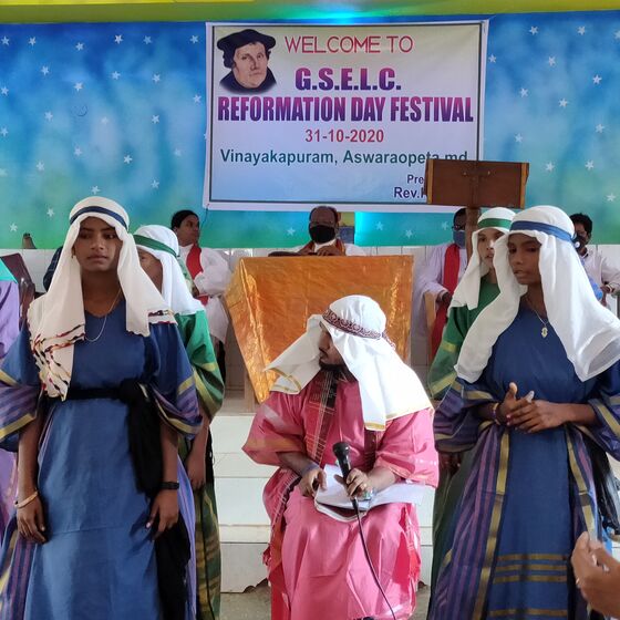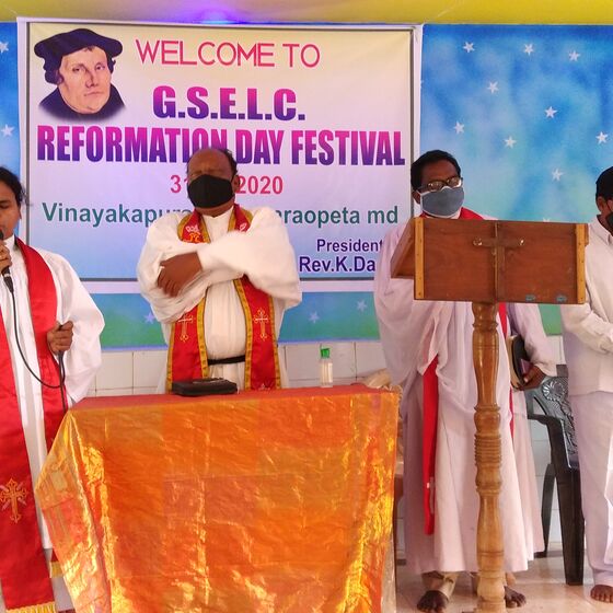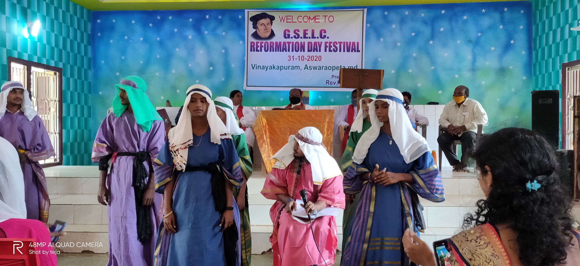 Mindestens so intensiv wie im Mutterland der Reformation begeht auch unsere Partnerkirche, die Good Shepherd Ev. Luth. Church diesen Tag. Etwa 300 Mitarbeitende und Gemeindeglieder waren diesmal nach Vinnayakapuram, dem Dorf mit der Kirchenzentrale, gekommen. Zusätzlich eingeladen waren einige Politiker und VIPs aus der Umgebung. Die GSELC versucht, sich mit allen gut zu stellen. Im Gottesdienst führten Jugendliche Szenen aus dem Leben Martin Luthers vor - ganz sicher mit indischen Augen betrachtet.