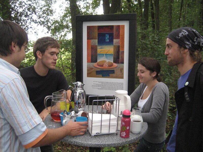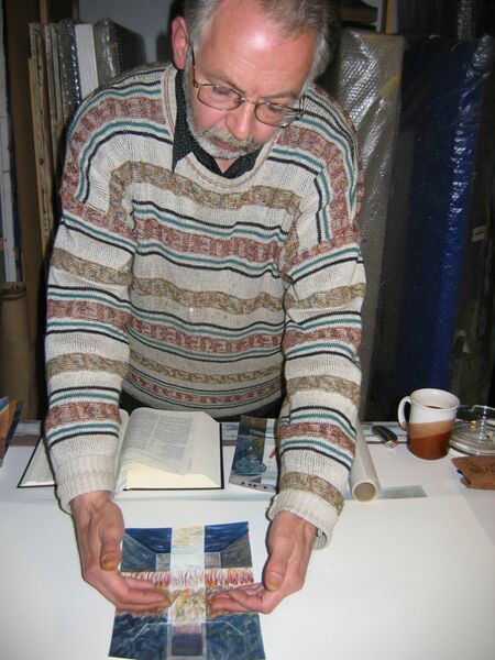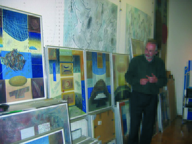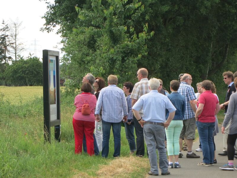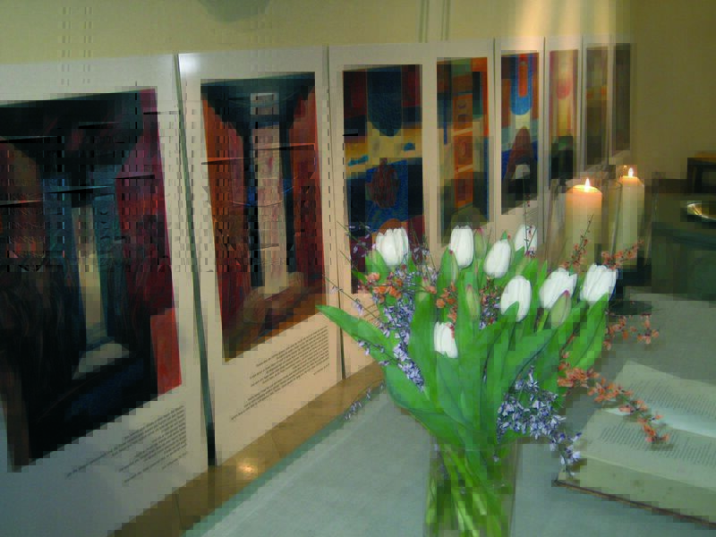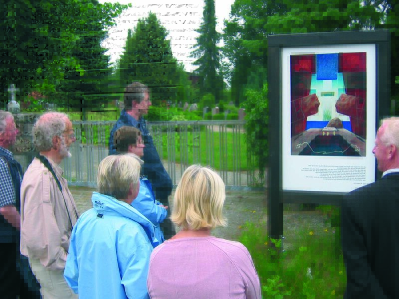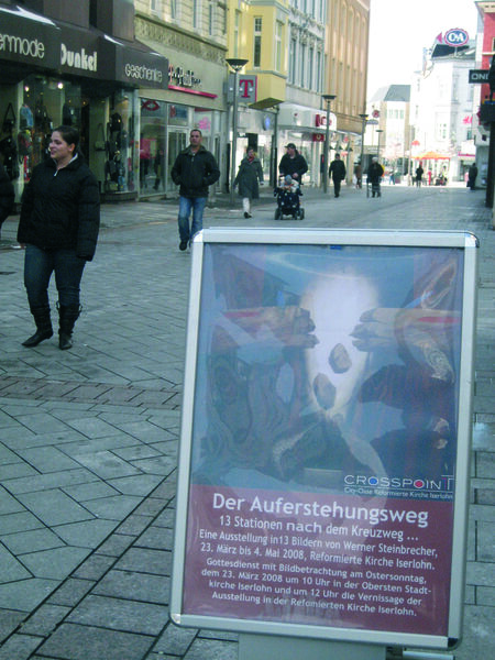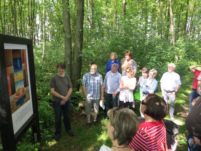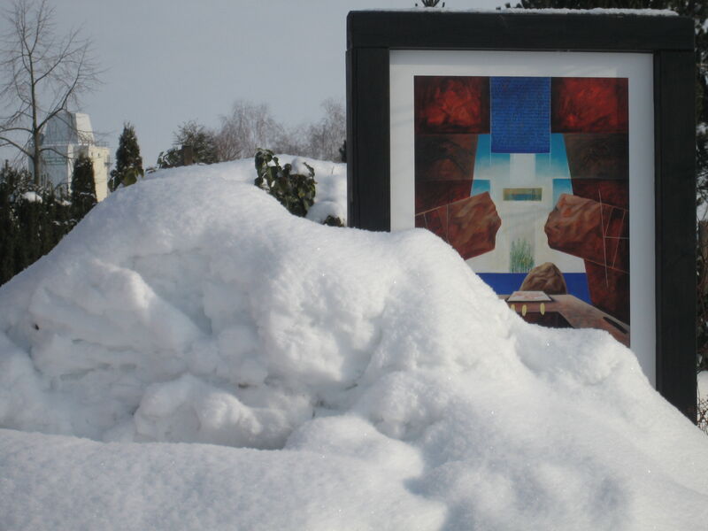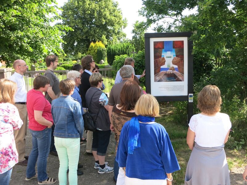 Begrüßt wurden die über vierzig Gäste vom Pastor der Gemeinde und Leiter des Missionarischen Zentrums, Wolfhardt Knigge. Er hob vor allem die Verdienste von Werner Steinbrecher hervor und stieß mit von Mitgliedern der Hausgemeinde gereichtem Sekt auf den inzwischen leider verstorbenen Künstler von Auferstehungs- und Schöpfungsweg an. Diakon Hermann Brünjes erzählte dann kurz von der Entstehung des Weges und führte durch den Empfang. Ausgestellt waren alle 13 Originale des Auferstehungsweges. Zunächst konnte man sich zu seinem Lieblingsbild stellen, dann zu einem Bild, dessen Bedeutung bisher verschlossen blieb. In kleinen Grüppchen tauschte man sich so über seine Erfahrungen auf dem Auferstehungsweg aus.