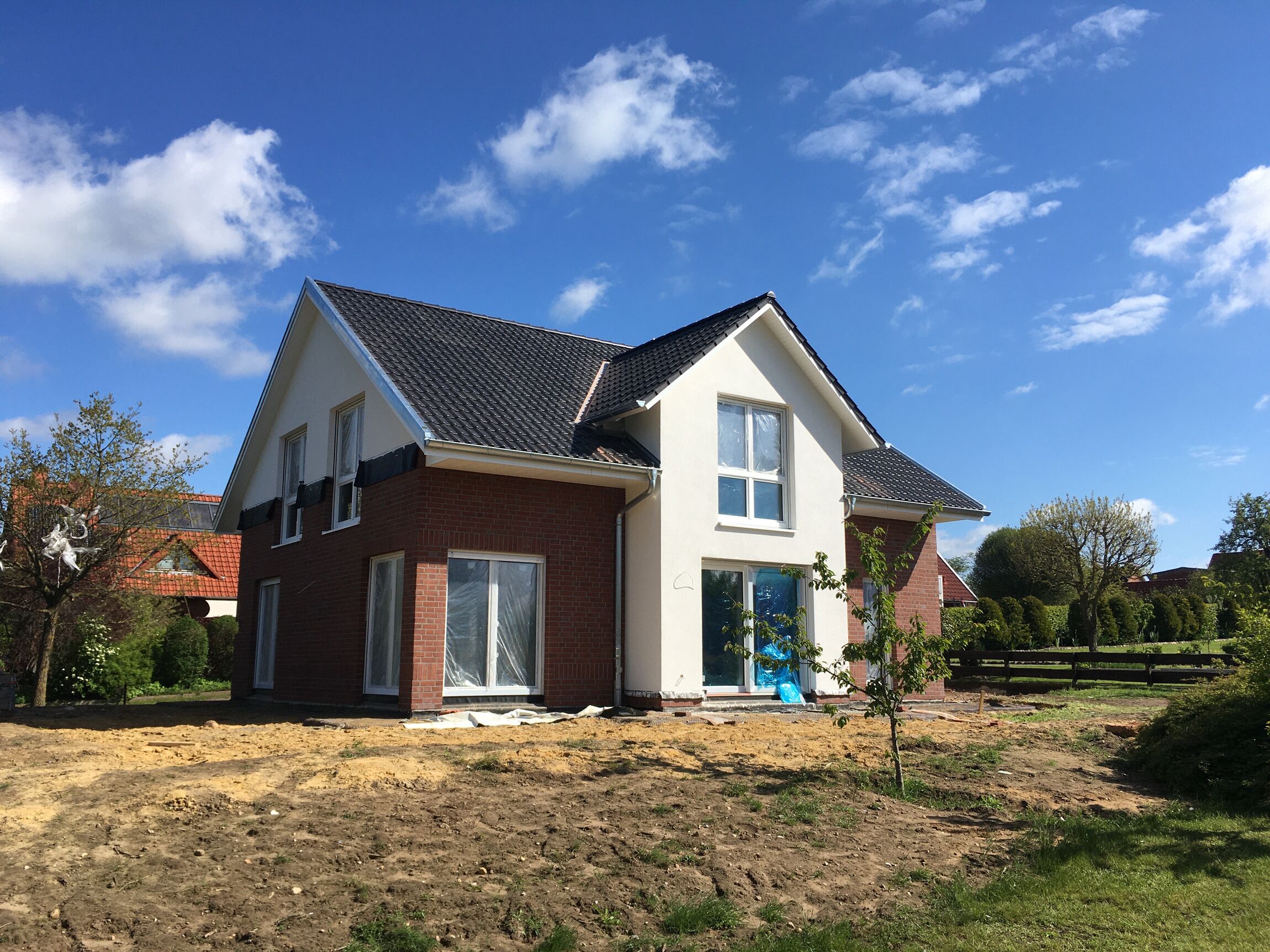 Nun ist das Bauzelt abgebaut. Darunter kommt ein schönes, ökoligisch hochwertiges Pfarrhaus zum Vorschein. Einmalig in Hanstedt: Das Grasdach auf der Nordseite.