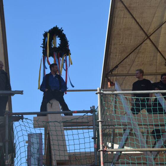 2. März 2021. Es hat geklappt: Bereits nach 14 Tagen Bauzeit feierte die Kirchengemeinde Hanstedt I das Richtfest ihres neuen Pfarrhauses. Wie in der AZ berichtet, wurde unter einem großen Zeltdach der Rohbau des energieeffizienten Hauses erstellt.